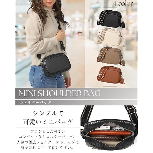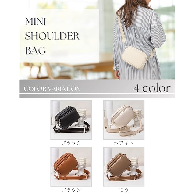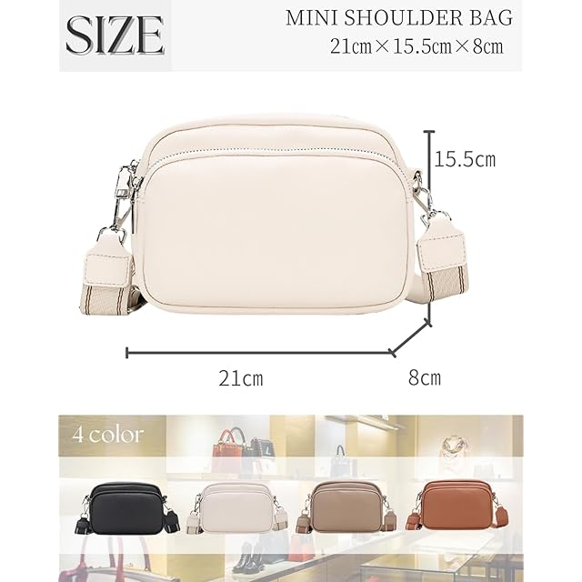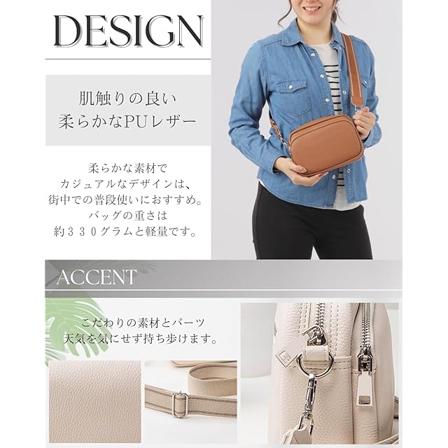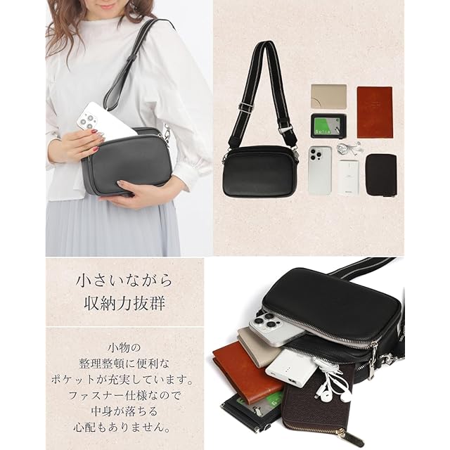【コンパクトなミニショルダーバッグ】小ぶりなバッグで、ちょっとしたお出かけに良いサイズ感で毎日でも使える。ポケットは充実で、内側に2つのポケット、外側に2つのファスナーポケットがあります。