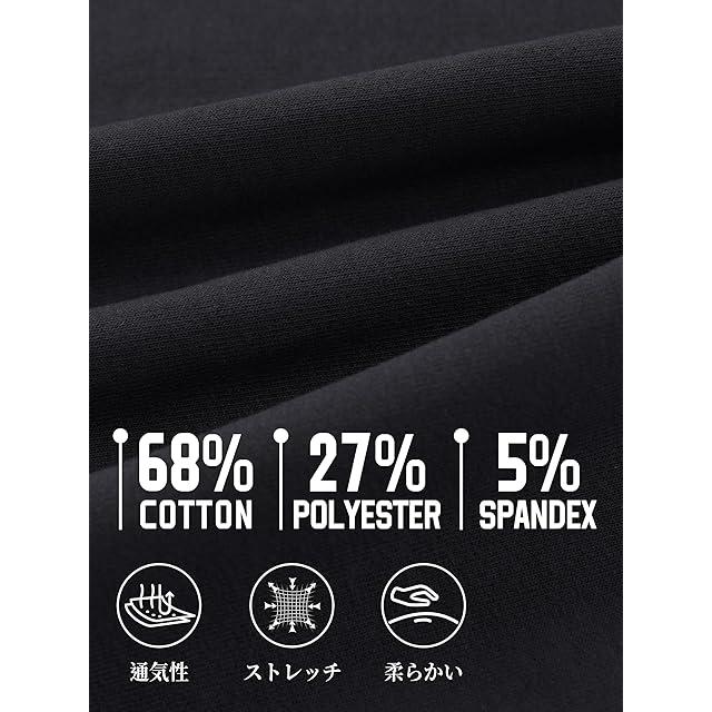 【快適な素材】68%コットン、27%ポリエステル、5%スパンデックス配合で、吸湿速乾性・通気性・ストレッチ性を兼ね備えています。肌触りが良く、運動時の汗もサラッと快乾。洗濯後もシワになりにくく、お手入れ簡単です