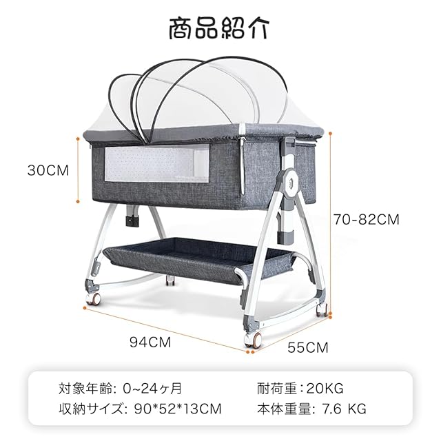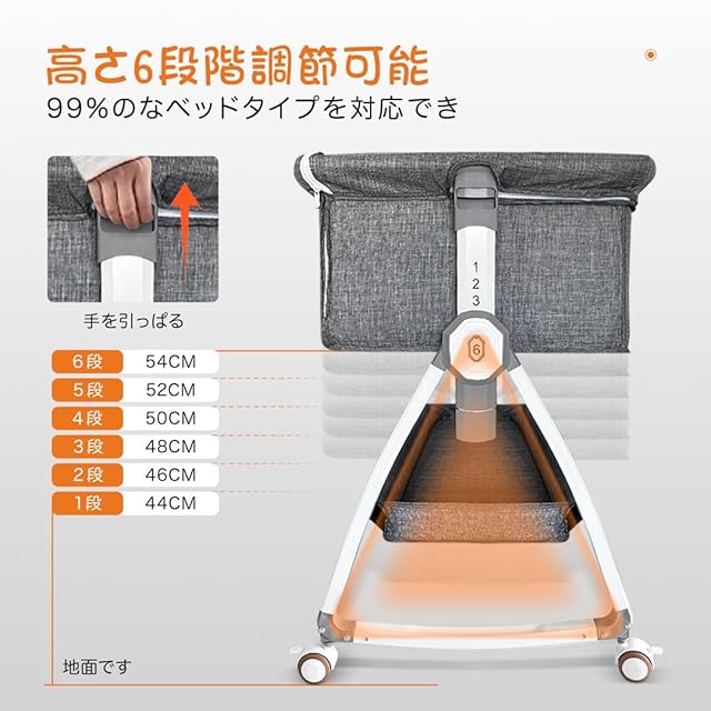 【高さ調節可能】高さ6段階調節可能で、市場に出回っているベッドタイプの99%と互換性があります。キャスターの安全ブレーキをロックする、お子様を快適な環境で眠らせてあげられます。ーベッドは斜めの調節可能で、新生児に対してミルクの吐くことを防ぐことができます。