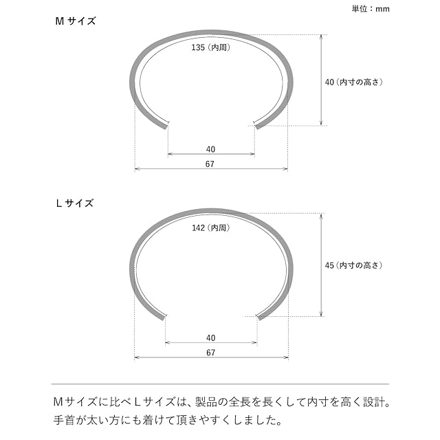 【サイズ(M)】:内径 約135㎜ / 口幅 約40㎜ / 幅:約6㎜ / 厚み:約3㎜ / 重さ:約15g 【サイズ(L)】:内径 約142㎜ / 口幅 約40㎜ / 幅:約6㎜ / 厚み:約3㎜ / 重さ:約16g