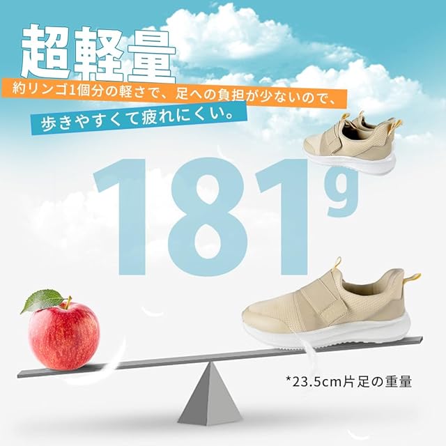 【超軽量181g】約リンゴ1個分の軽さで、足への負担が少ないので、歩きやすくて疲れにくいです。履きやすいだけでなく持ち運びにも優れています。旅行や出張にも便利な一足です。ランニング、ウォーキングシューズや運動靴としても優れた選択肢です。