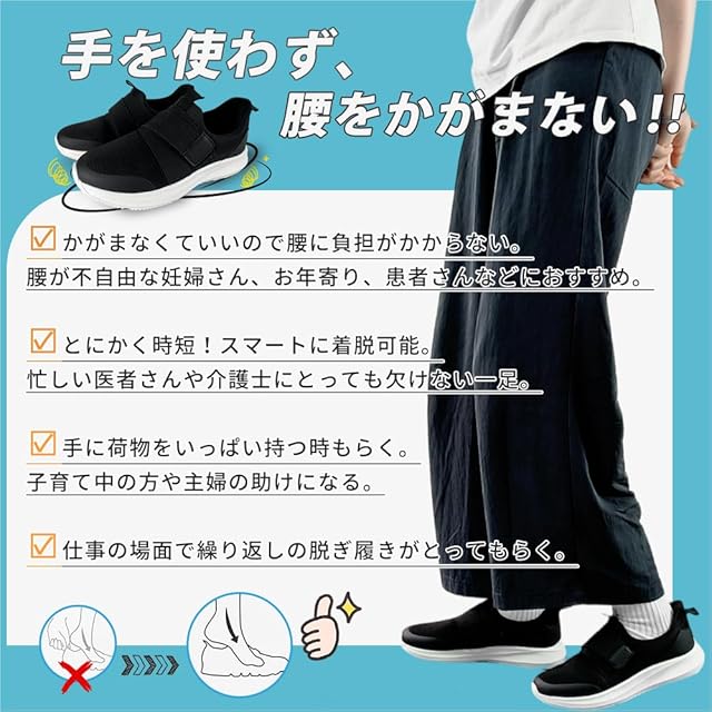 【たったまま履けるスニーカー】腰かがまず、手を使わず、靴ベラいらず!立ったまま1秒で履けます。かかと部分の傾斜によりスムーズな足入れを実現。腰が不自由な妊婦さん、お年寄り、患者さんなどにおすすめ!忙しい時も、手に荷物をいっぱい持つ時も、仕事の場面で繰り返しの脱ぎ履きも楽!母の日や父の日の贈り物にもおすすめ