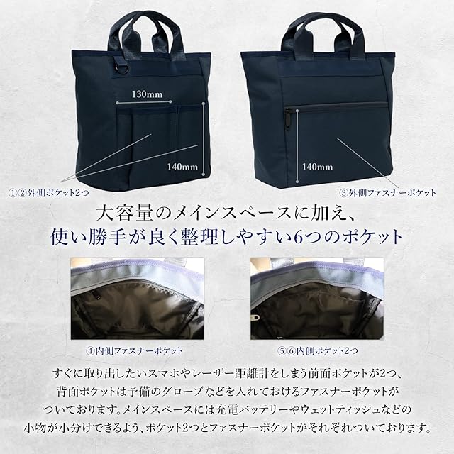 ✅【小物が行方不明にならない豊富な収納スペース】メインスペースに加え、前面ポケット2つ、背面にファスナーポケット1つ、内側前面にポケット2つ、内側背面にファスナーポケット1つと、ラウンドに回る際必要な小物が十分に小分けできる収納スペースを完備しております。前面ポケットはiPhone 13 Pro Maxでも入る大きさで、仕事用とプライベート用2台持ちでも両方入れておくことができます。背面ファスナーポケットには例えばラウンドで使用する予備のグローブや、ハンカチ、ティッシュ、予備のスコアシートなどを入れられます。内側2つのポケットには充電器やウェットシート等の小物を収納し、内側ファスナーポケットには鍵や小銭入れなどの貴重品を入れておけば安心してラウンドに集中することが出来ます。もちろんメインスペースは650mlのペットボトルが縦で6本入る程の大容量なので、予備のゴルフボール箱や財布、軽食やサングラスを入れた状態で、夏場の着替え用ポロシャツなどの着替えも収納出来ます。普段使いでの利用であれば、iPad miniやiPad Pro11インチの大きさが収納可能となっております。
