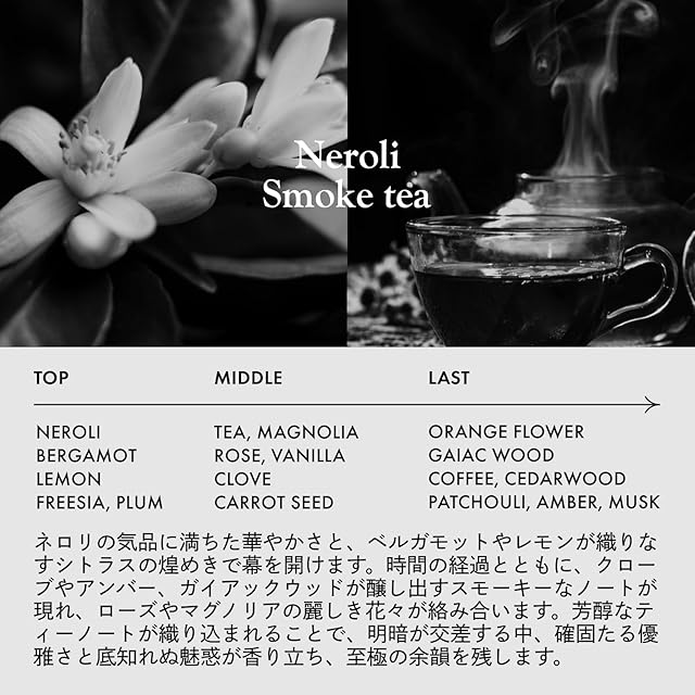 Neroli Smoke tea(ネロリスモークティー) ネロリスモークティは、ネロリの気品に満ちた華やかさと、ベルガモットやレモンが織りなすシトラスの煌めきで幕を開けます。 時間の経過とともに、クローブやアンバー、ガイアックウッドが醸し出すスモーキーなノートが現れ、ローズやマグノリアの麗しき花々が絡み合います。 芳醇なティーノートが織り込まれることで、明暗が交差する中、確固たる優雅さと底知れぬ魅惑が香り立ち、至極の余韻を残します。 <Topnote(トップ)> ネロリ、ベルガモット、レモン、フリージア、プラム <Middlenote(ミドル)> ティー、マグノリア、ローズ、ベルガモット、クローブ、キャロットシード <Lastnote(ラスト)> オレンジフラワー、ガイアックウッド、コーヒー、シダーウッド、パチュリー、アンバー、ムスク