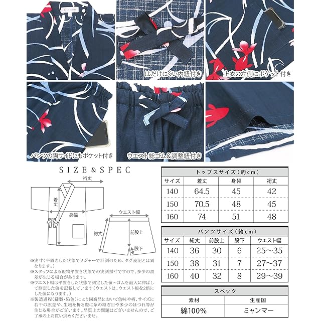 商品名:[ニシキ] 24908-1 甚平 女の子 上下セット 綿100% 涼しい ルームウェア お部屋着 パジャマ 寝間着 ナイトウェア 前開き 花柄 和柄 キッズ ジュニア スクール (鉄紺地ひまわり/160cm)
