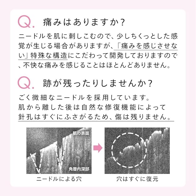 【快適にお使いいただくために】●骨の支えや筋肉の厚みがない、まぶたや目のきわ、唇への使用は避けてください。 ●美容液の浸透※が妨げられる場合がありますので、UVケア製品やファンデーションをつけている状態ではご使用にならないでください。 ●肌に押し当ててノックするのが難しい方は、まずお手元で2〜3回ほどノックして美容液をニードル先端に溜めてから、肌に対して垂直にポンポンと押し当ててください。浸透※促進ニードルが浸透※経路をつくっていますので、角層の中まで美容液を行き渡らせることができます。肌の上に残っている美容液は、指の腹でやさしくなじませてください。 ※角層まで