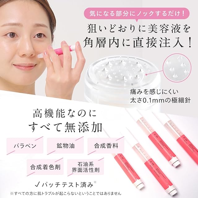 【毎日続けやすい高密度美容液】1本2.5mLの集中処方で、少量でもしっかりと実感できる美容液。ノックするだけの簡単操作で、衛生的かつ持ち運びにも便利。お悩みサインの気になる部分に、ニードルを押し当ててカチッとノックするだけで、プチッ、カチッ、3秒間じゅわわ~でダイレクトに美容液を注入※1します。 ※1 角層まで