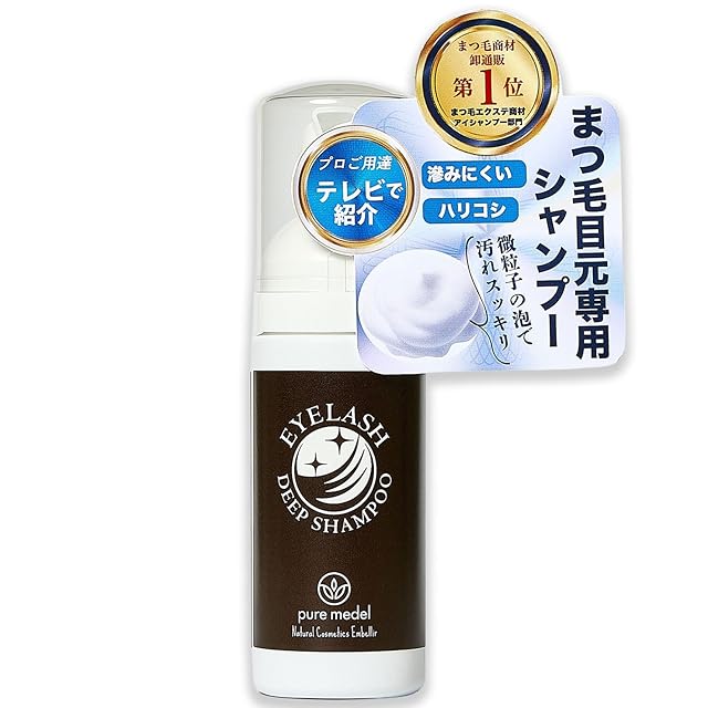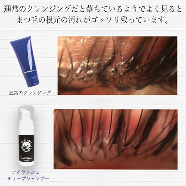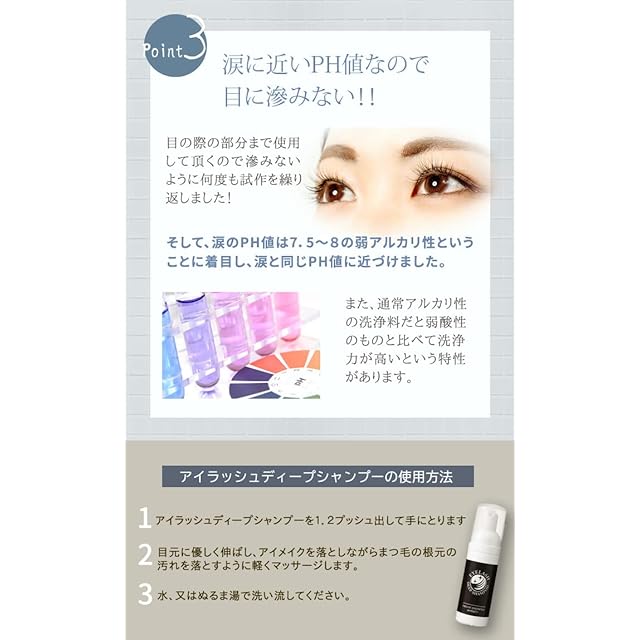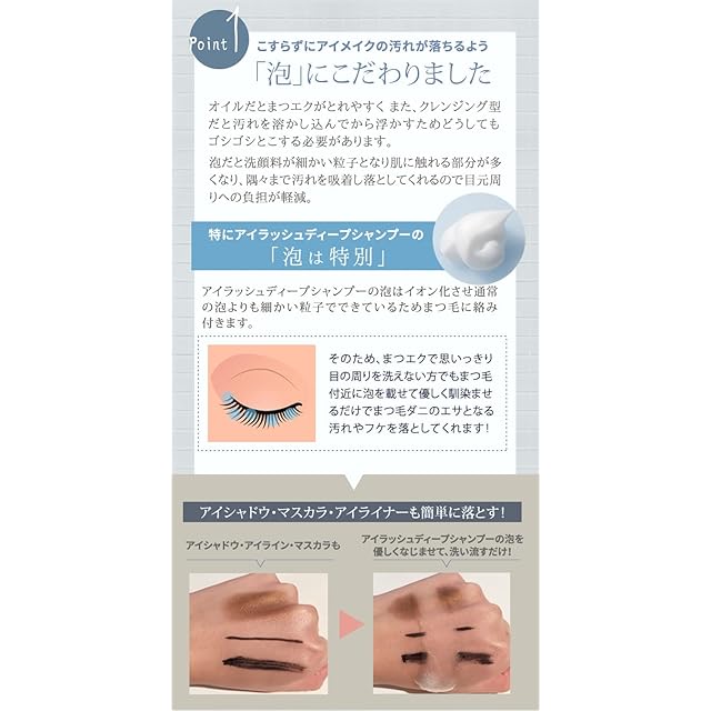 アイラッシュディープシャンプーの泡はイオン化させ通常の泡より細かい粒子で できているためまつ毛に絡みつきます。 そのためまつ毛付近に載せて優しく馴染ませるだけでまつ毛ダニの餌となる汚れや フケ、アイシャドウ、アイライン、マスカラも簡単に落としてくれる。