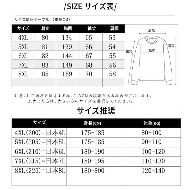 サイズの推薦 ★ 【4XL(200)=日本4L】身長:175-185cm / 体重:80-100kg【5XL(205)=日本5L】身長:175-185cm / 体重:90-110kg 【6XL(210)=日本6L】身長:180-190cm / 体重:100-120kg【7XL(215)=日本7L】身長:180-195cm / 体重:110-130kg。
