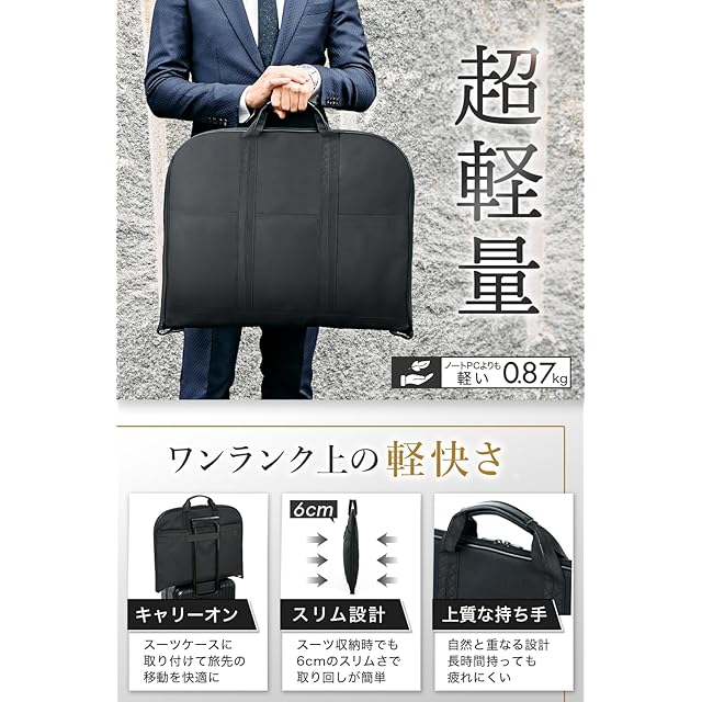 機能性とスタイルを兼ね備えたガーメントバッグ 厚手のポリエステル生地を採用し、雨風からスーツをしっかりと保護します。スリムながらも想像以上の収納力を持ち、必要なものを収めることができます。重さはわずか870gで、旅先での持ち運びも軽快です。スタイリッシュさと機能性を高次元で融合させた、出張や旅行に最適な選択肢です。 ■素材:ポリエステル ■取扱説明書:あり(QRコード付きタグからオンラインでご確認いただけます) ■付属品:専用ハンガー ■生産地:中国 <使用上のご注意> ※製品は手作業で生産しているため、同じ製品でもサイズに個体差が生じる場合があります。 ※本商品はビジネスやトラベルを目的として企画・製造されています。本来の目的以外の使用は破損の原因となる可能性があるためお控えください。 ※S字フックの使用荷重は約4kgです。この重量を超える物を掛けると、フックやチェーンが破損する恐れがあります。 ※ 水などで濡れた際は、柔らかな布で軽く押さえるように水分を拭き取り、風通しの良い場所で陰干ししてください。