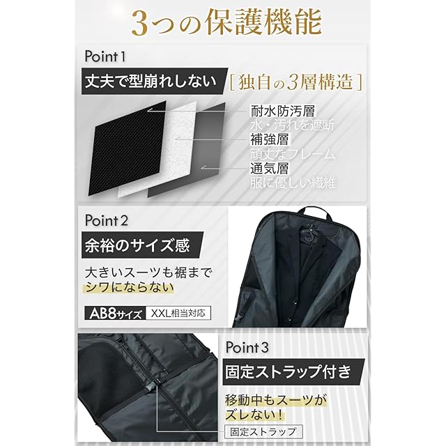 【機能的な素材が実現する保護力と耐久性】厚手のポリエステル生地が雨風から荷物を守り、型崩れしない硬さがスーツをしっかり保護します。要所に施された二重縫製と、信頼性の高いYKKファスナーを使用することで、バッグ全体の耐久度が一層向上しています。