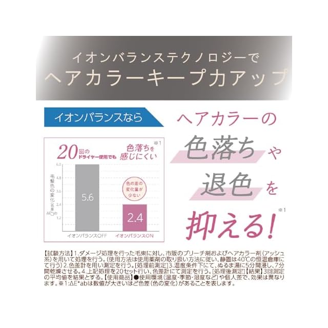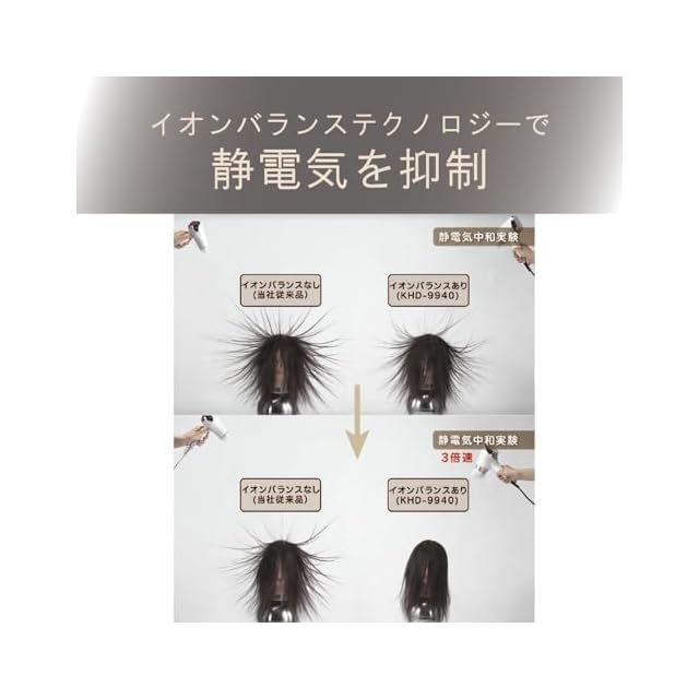 イオンバランステクノロジー搭載。静電気を抑制し、髪の広がりを抑えてまとまりよく、うるおいアップ。
