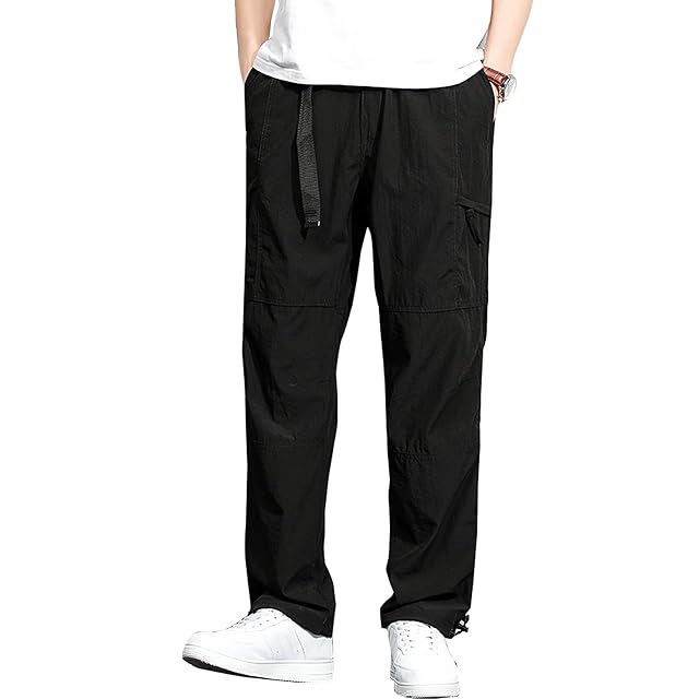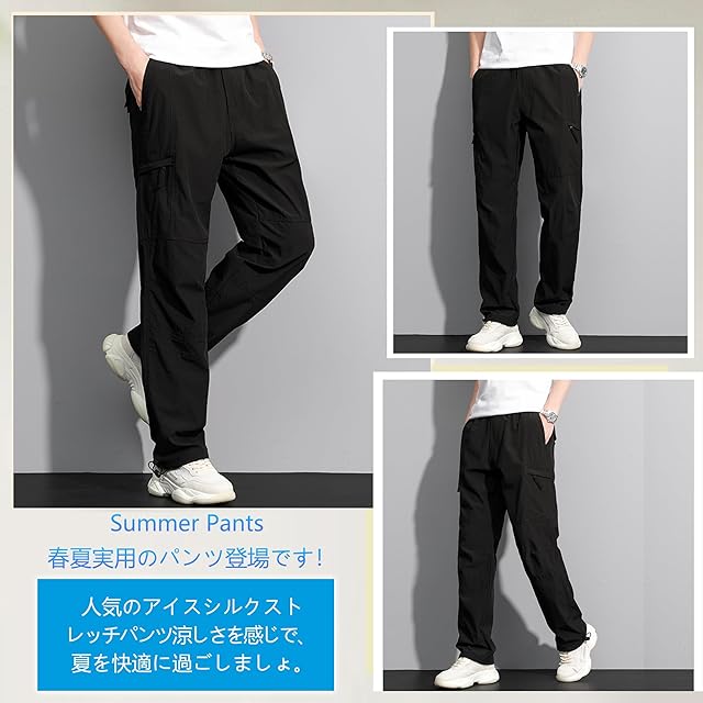 [Kayiyasu] ズボン メンズ カーゴパンツ 接触冷感 夏 通気 涼しい 軽量 カジュアル ウエストゴム 大きいサイズ 速乾 ワイド ロング アウトドア ゆったり ずぼん 前開き 黒 春 夏(タイプ2-黒, 2XL) | Trend Design BASE店
