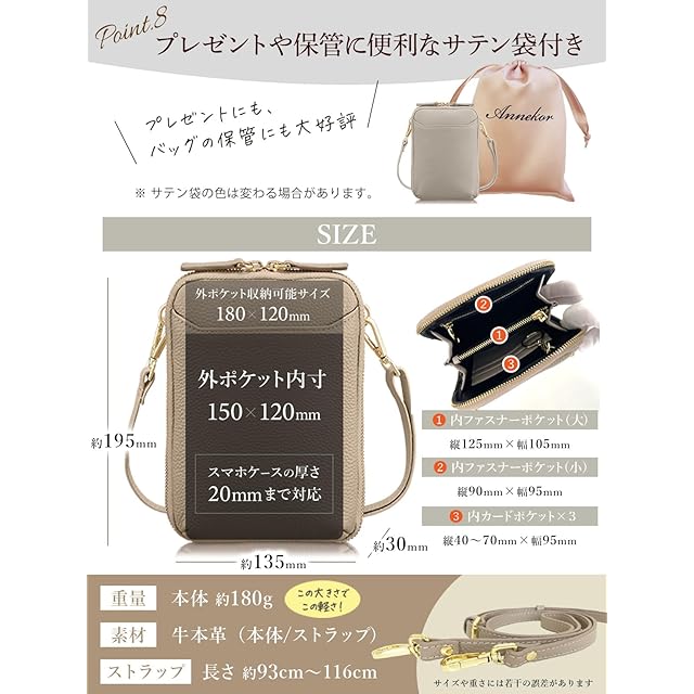 ✅【上質な本革スマホポーチ】上質なシュリンクレザーを使ったスマホショルダーポーチが登場、丈夫でキズ・汚れがつきにくく、シンプルなデザインの中に詰め込まれた高機能が特徴です。すぐに劣化してしまうフェイクレザー(PUレザー)とは全く違った高級感で永くご利用いただける本革素材です。【サイズ】縦190㎜/横135mm/奥行30mm<BR> ✅【コンパクトで便利】ちょっとした時にサッと斜め掛けでお出掛け。わずか180gのポーチは邪魔にならずお子様連れやお仕事時も両手を使う事ができ便利です。メインスペースは、真ん中に貴重品などを入れるファスナーポケットがあり、両側に二層式のフリースペースがあり、側面にはカードポケット3枚分やファスナーポケット、キーリングなど、うれしい工夫が詰まった機能が満載で、小銭やお札、クレジットカードなどもそのままバッグに収納できる優れものです。<BR> ✅【大きめのスマホも収納OK】外ポケットの内寸は縦17㎝横12㎝で、大きなサイズのiPhone13ProMaxも対応しております。「コンパクトすぎてスマホの出し入れがし難い」という事が無いよう、数十種類のスマホで実調査をして「スマホの出し入れがちょうどよい大きさ」に仕上げました。<BR> ✅【サイズ調整可能な本革ストラップ】手によく馴染む本革のストラップは、長時間肩掛けしていても違和感がありません。控えめなゴール後の金具がアクセントのストラップは93-116cmの長さで調整が可能で使いやすさ抜群です。<BR> ✅【類似品にご注意ください。お買い物は日本企業で】見た目の画像は同じような商品でも、作る工場や品質・対応は全く違います。すぐに壊れる・色が画像と違う・連絡をしても返事がない等色々なトラブルがございますので、販売業者は慎重にお選びくださいませ。