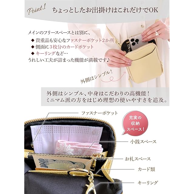 ✅✅【コンパクトで便利】ちょっとした時にサッと斜め掛けでお出掛け。わずか180gのポーチは邪魔にならずお子様連れやお仕事時も両手を使う事ができ便利です。メインスペースは、真ん中に貴重品などを入れるファスナーポケットがあり、両側に二層式のフリースペースがあり、側面にはカードポケット3枚分やファスナーポケット、キーリングなど、うれしい工夫が詰まった機能が満載で、小銭やお札、クレジットカードなどもそのままバッグに収納できる優れものです。