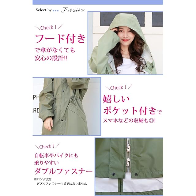 【選べる着丈2種類】膝丈とロング丈の2種類からお選びいただけます。※ロング丈は+9cm!<br> 普段のコーディネートに馴染むシンプルで可愛いフード付きレインコート。雨の日の通勤通学もおしゃれに♪<br><br> 【雨に強い耐水圧10,000mm】雨具に適した防水性&撥水性の高い生地を使用!<br> 雨具とわかりにくいデザインで、アウター感覚で雨対策。フード付きなのも嬉しいポイント。<br><br> 【ポケット付き】雨水の侵入を防ぐフラップ付きのポケットが左右両方にあり、スマホ等の小物を入れることもできます。<br> 袖丈が少し長めになっているので、長袖を着ていても袖口が濡れにくいです。<br><br> 【膝丈はダブルファスナー】上下から開くダブルファスナーなので動きやすく、自転車やバイクにもまたがりやすいです。<br> 裾も絞れるので洋服が濡れるのをしっかりカバーできます。※ロング丈はシングルファスナーです。<br><br> 【収納袋付き】レインコートと同色のポーチ付きで折りたたんで収納でき、持ち運びにも便利です。<br> 使用時はポケットにポーチを入れておけるから無くす心配も少ないです。<br><br> [カラー]カーキ/ライトグリーン/ベージュ/ピンク/ターコイズブルー/ネイビー/グレージュ [サイズ] M,L,XL × 着丈2種類