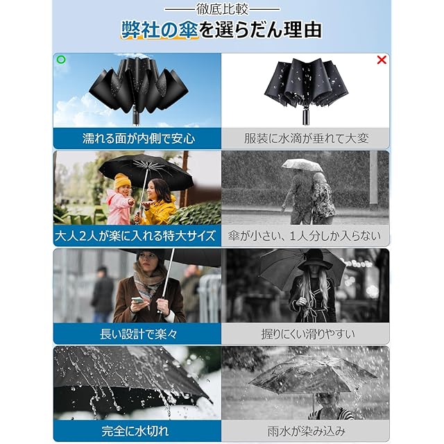 ☔【ワンタッチ自動開閉&大人気逆折り式傘】業界最新な技術を採用されています、ボタンを押すだけで片手でも簡単に開閉できます。片手がふさがっているときでも操作できるので便利。傘を閉じる時に撥ねてくる雨粒で袖が濡れる気まずさにさようなら!雨の日の車の乗り降り、子供を抱きかかえている時や荷物の多いときも楽です。外回りの仕事、突然の夕立にもサッと広げる事が出来、いつでも安心。折りたたみ傘なので出張、旅行の携帯用傘として、車の中に常備していると大変便利です。さらに、閉じたときに濡れた部分が内側になるという逆折り式折り畳み傘です。手が濡れない傘として超人気です。閉じる際に手が濡れにくく、人混みや電車の中でも、まわりが濡れないように気を遣う必要がないこと。衣服・荷物・車のシートなどを濡らしたくないときにも便利です。