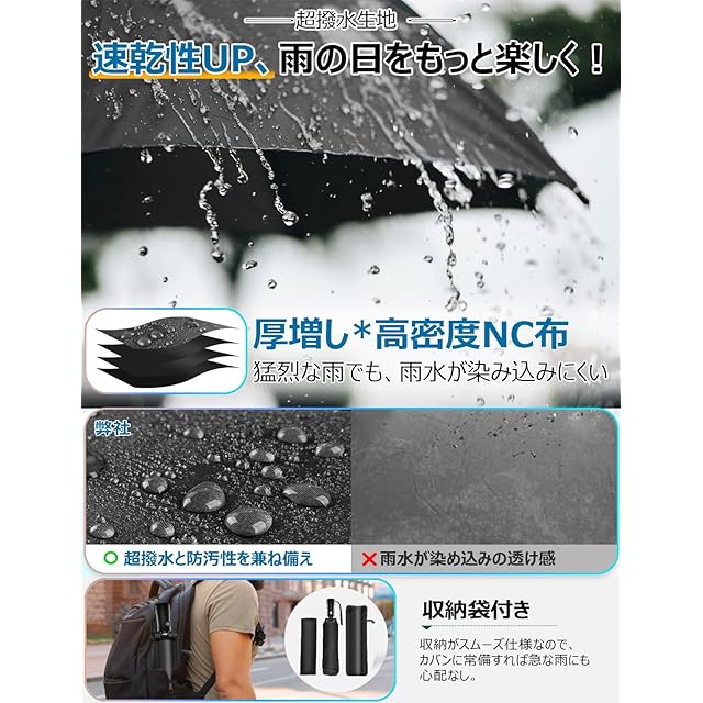 ☔【超撥水性&収納袋付き】使い終わった濡れた傘を持ってタクシーだったり電車やバスなど公共交通機関に乗ったり、オフィスや家など建物の中に入ったり、特に満員電車など人混みでは特に気をつけないと周りの人に迷惑になってしまいますよね。弊社の傘は高密度で防水性の高い布地を採用されたことにより、撥水性に優れています。水滴がかさに落ちた瞬間に水玉になりコロコロと滑り落ちていきます。傘を閉じた後、ひと振り、もしくは数回振るだけで雨粒をほとんど落とせます。そして、収納袋が付き、使ったばかりの傘をしまっても服やバッグを濡らしません。