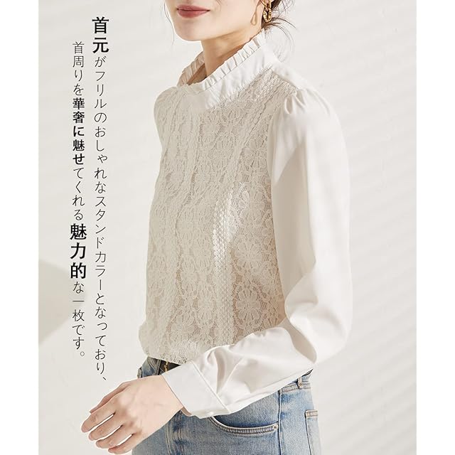 [Yino] (イノ) レース シャツ ブラウス レディース トップス 花柄 フリル 立ち襟 女性らしい 可愛い 着痩せ 長袖 おしゃれ 通勤 オフィス カジュアル デート フォーマル 秋 冬 春 | Trend Design BASE店