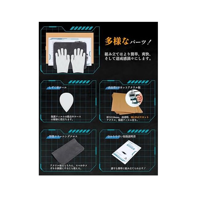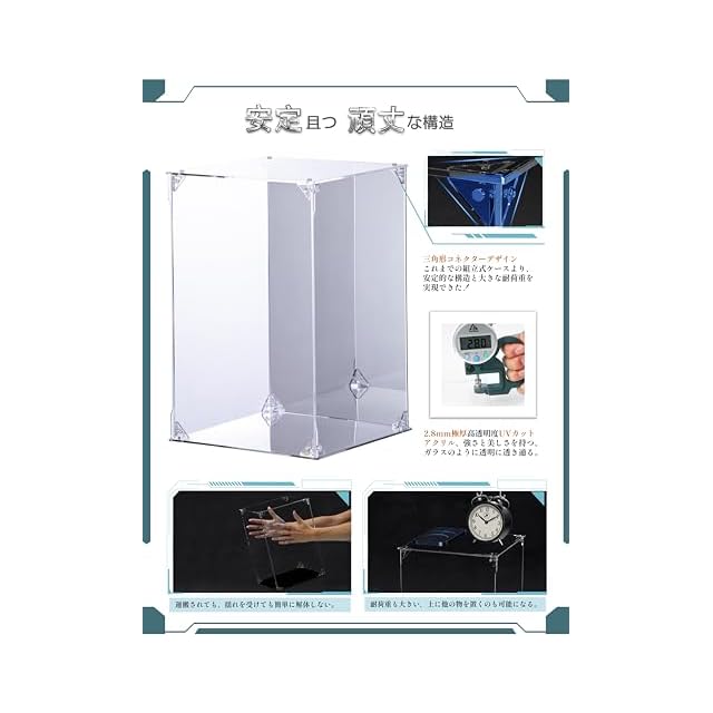 【安心できる】 ● デザイン特許を取得した三角形コネクター固定構造設計は、はめ込み式展示ケースよりも安定しており、運搬されても、揺れを受けても簡単に解体しない ● 耐荷重も大きい、上にさまざまなアイテムが置けます ● アクリル板に角丸加工を施します、手に優しい ● オリジナルの組み立て工具、特製クリーニングクロスや手袋が付属しており、簡単に組み立てや分解ができます。