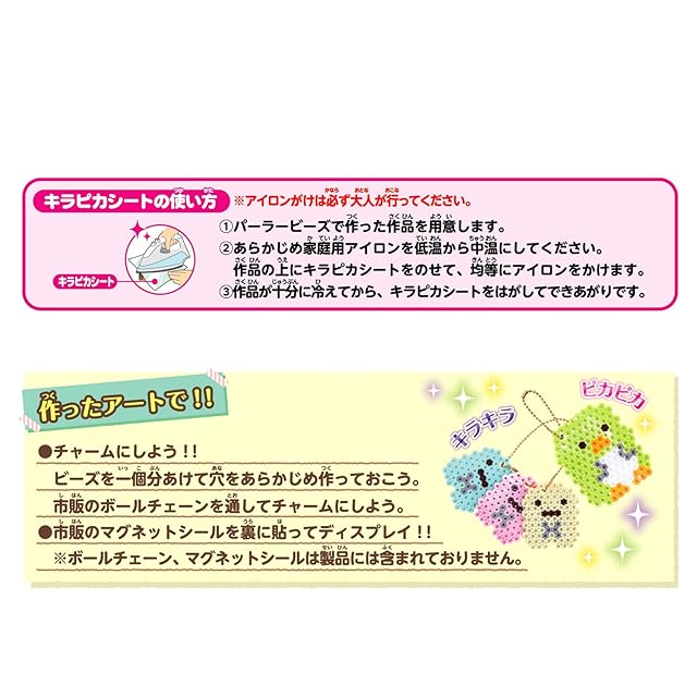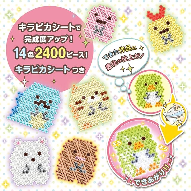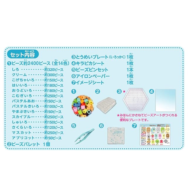 セット内容:ビーズ約2400ピース(全14色)、<br> とうめいプレートL(ろっかく)1枚、キラピカシート1枚、<br> イメージシート1枚、ビーズパレット1個、<br> ビーズピンセット1本、アイロンペーパー1枚