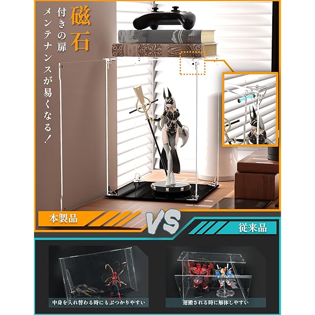 【強力磁石付きの扉】次世代のフィギュアケースデザイン!マグネット付きの前扉でコレクションの出し入れやメンテナンスがより便利に。前扉は最大270度まで開くことができます。コレクションの表示角度や可動フィギュアのポーズなど、ディスプレイケースを解体せず、いつでもどこでも自由に調整できます。