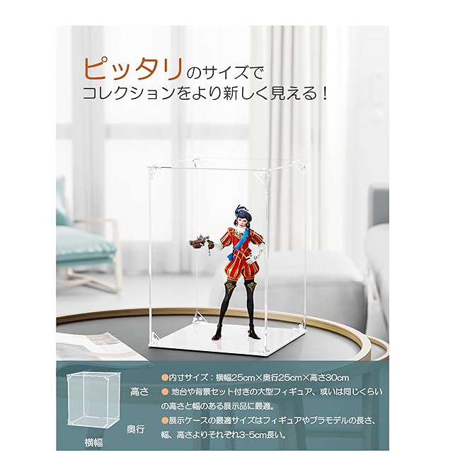 【サイズを決める】● 内寸サイズ:横幅25cm×奥行25cm×高さ30cm ● 外寸サイズ:横幅26.6cm×奥行26.3cm×高さ31cm ● 展示ケースの推奨寸法は飾る物の(幅・奥行×1.1)+5cm、(高さ×1.1)+2cm ● 1/7と1/6スケールのフィギュア、1/100スケールのガンプラ、或いは同じくらいの高さがある大型展示品に適したサイズです。