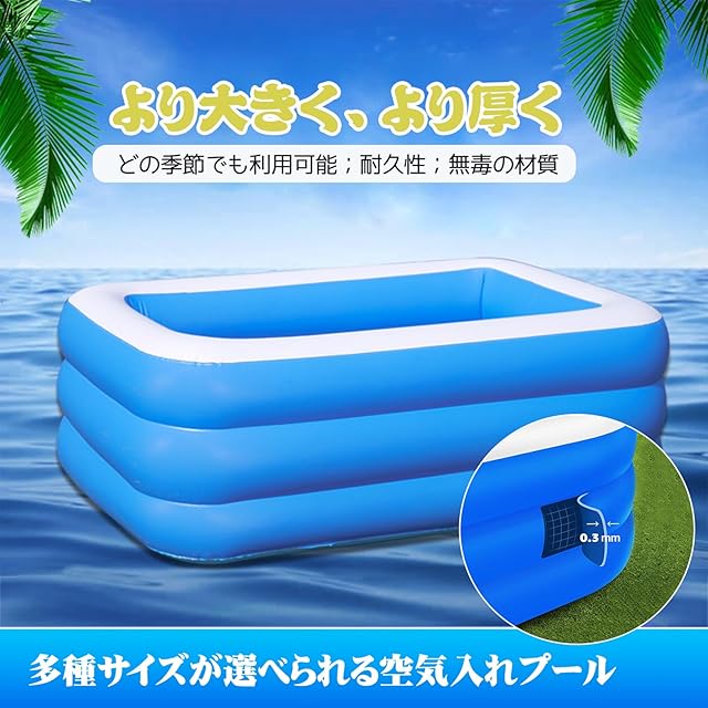 【大容量家庭用プール】:3サイズのビニールプールはご用意しており、ご自由に選択できます。サイズ: M(210x140x60cm,1〜4人を収容でき)、サイズ: L(260X165X54cm,1〜6人を収容でき)、サイズ: XL(300X172X54cm,1〜8人を収容でき)大人でもプールの中で快適に手足を伸ばすことができます。暑い夏は、子どもと水遊びをして夏を楽しく過ごしましょう。 【無毒PVC材質・安心安全】食品レベルの安全材料を採用し、高温に耐えるPVC材質、耐久性あり、厚くて破損しにくい、プールを舐めたり、プールの水を飲んだりして体に危害を及ぼす心配はありません。大人でも子供でも安心して使えます。 【三層気室・三つ空気入れ口】3つの独立した気室があり、それぞれに二重の空気入口と自由に流れる排気弁も付いておりますので、大人用のプールとして余分な重量に耐えられる同時に空気漏れも防止できます。 【使いやすい】:インフレータブルスイミングプールは使いやすいです。プールを地面に広げてから、電動ポンプ(含まれていない)を使用してすべてのポートに空気を膨らませ、水を注いで操作を完了します。底面にある排水栓は便利で排水も速いのです。使用後の片付けは時間と精力をかからず、折り畳み式ので、空間も占めません。❊このセットには空気いれ道具が含まりません。 【素晴らしい贈り物】: 自宅でいつでもレジャープールを作れて、公共の場所に行かないで、見知らぬ人とプールを共用する必要がないです。子供にきれいで衛生な娯楽環境をあげます。お子様やご家族、ご友人に贈ることができる素敵なギフトです。