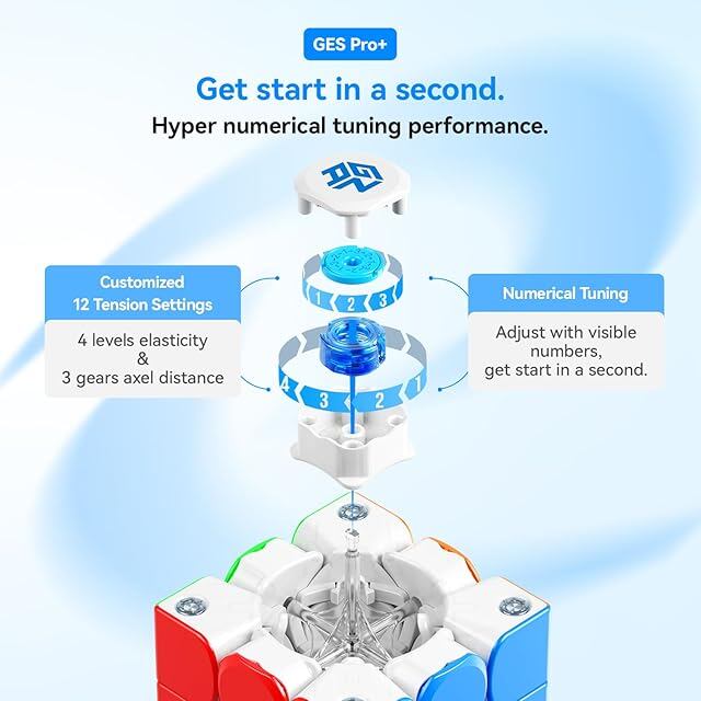 GES PRO+ - まだGES+のハンドフィールを経験していますか? 簡単な調整を探求するために、GES Pro+(GANエラスティックシステム)デザインを試してみましょう! 12のカスタマイズ可能なテンション設定、4つの弾力性レベル、3つのギア軸距離を提供します。そして、目に見える数字のナメリカル調整システムにより、簡単な調整が可能となり、あなたのパーフェクトなキューブ感覚がすぐに見つかります。