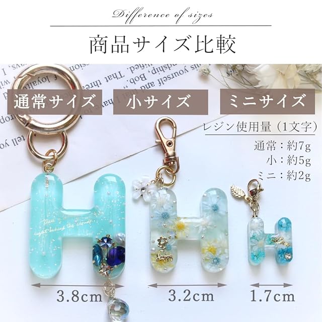 ✅【商品サイズ】 完成品のサイズ:画像参照下さい。レジン使用量:1文字約5g イニシャルキーホルダーやバックチャームにちょうどいいサイズです。 耐熱温度:-40℃~+230℃