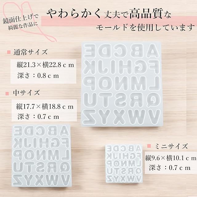 ✅【商品について】丸文字のアルファベットが作れるシリコンモールド3サイズセットです。通常サイズと一回り小ぶりな中サイズとミニサイズ(記号なしタイプ)の3つのセット。3点まとめてご購入いただくより嬉しい価格でご用意しました!それぞれストラップやイニシャルキーホルダーやバックチャーム、小さなチャーム作りにも様々なアイテムをお作り頂けます。柔らかく丈夫な良質なので、取り出しやすく使いやすいモールドです。UVレジン、エポキシ樹脂、樹脂粘土などにご利用いただけます。 ✅【商品サイズ】 完成品のサイズ:画像参照下さい。レジン使用量:1文字約5g イニシャルキーホルダーやバックチャームにちょうどいいサイズです。 耐熱温度:-40℃~+230℃<br><br> ✅【注意事項】完成品は付属しておりません。シリコンモールドの型のみになります。<br><br> ✅【【3つのサポート】 ①メールサポート:レジン認定講師 ポニーココさんが初めてレジンをされる方やもっと上手になりたい方にも親切・丁寧にわかりやすくメールにてお問合せをお受けしております。②動画コンテンツ:動画共有サイトにて「シリコンモールド エバーガーデン」で検索頂くと制作動画やプチテクニックもご紹介しております。③ あんしん保障:万が一、不良があった場合は、使用の有無に関わらず、交換又は返金対応いたします。✅【豊富な品揃え】 他にもたくさんの種類のシリコンモールドを販売しております。400種類以上のシリコンモールドを揃えております。あなたが探していた商品にきっと出会える♪商品ページ左上の『Ever garden』をクリックして頂くとご覧頂けますので、ゆっくりとご覧くださいませ。
