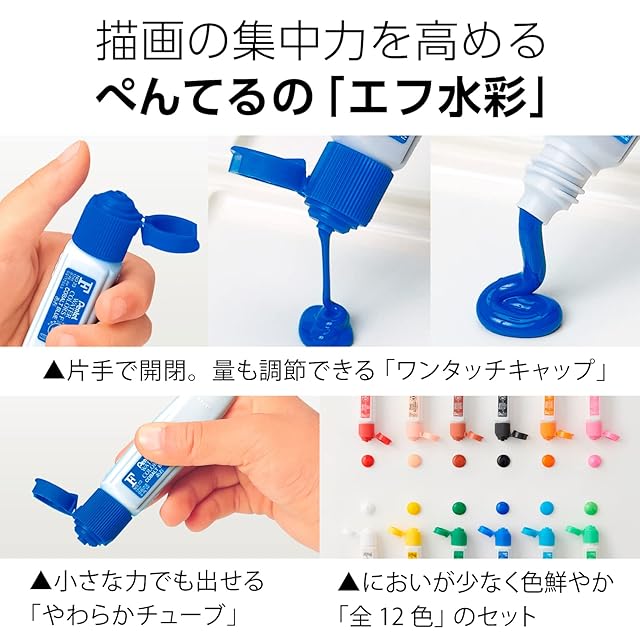 【セット内容】エフ水彩12色、画筆(丸筆2種)、パレット、大型筆洗バケツ、筆ケース、スポンジ