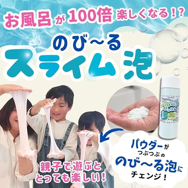お風呂で楽しく遊びながら、脳と身体の発達を促進する、新発想の知育玩具「子どもの才能 のびーるせっけん」 【製品紹介】 ・未体験!パウダーに水を加えて混ぜると、スライムのように、びよーんとのびる、楽しい泡にチェンジ! ・のびーる泡は、大人も子どもも夢中になる、ザラザラ・つぶつぶ・もちもち感触 ・のびーる泡はとても強力。水を加えすぎなければ、1時間以上連続して遊ぶことができます ・遊ぶだけで脳が育つ!指先は第2の脳。楽しく遊ぶだけで、創造性・集中力・忍耐力・応用力などの知能が高まります ・大人も驚きの本格的な良い香り。リゾートホテルのようなシトラスと、ジューシーなピーチの2ラインナップ ・のびーるせっけんのオリジナルの技で遊べる!ロープのように回したり、アイスや風船など、色んな形が作れます。 2人で伸ばして、どこまでのびるかチャレンジするのも楽しい♪ 【反響】 ・テストマーケティングを行った沖縄・国際通りの直営店舗「南の島のふしぎブルー」では、小学生たちが大熱狂!テスト期間中で既に累計12000個以上を販売。 SNSでも大反響を呼び、現在TikTokでは総再生数200万回以上を記録しています。 【想定される遊びシーン】 ・寒い季節は、お風呂で遊べる楽しいアイテムとして大活躍。お風呂嫌いのお子さんの対策にも活用いただいています ・水遊びのシーズンにも大活躍!お庭でのプール遊びや、川遊びなどで、全身スライム遊び!とても盛り上がるアイテムです 【パパママに嬉しいポイント】 ・片付けがとっても簡単。遊んだ後は水で流せば、お片付け終了 (※排水溝に詰まりませんか?と良くご質問を頂きますが、直営店のお試しでこれまで一度も詰まったことはありませんのでご安心ください。) ・近年「浴育」というキーワードが注目されるなど、バスタイムが親子のコミュニケーション時間として重要性が増しつつあります。 スマホ依存気味の子どもたちも、楽しい感触に夢中になり、パパママは一緒にお風呂で遊びながら、手軽に知育のための時間や家族の豊かなコミュニケーションの時間を作ることができます。 子どもが夢中になれる最適な伸びが得られるよう、安心安全にこだわりながら、1年半にわたり試行錯誤を重ねて開発。 一般的なスライムには中毒の危険性のあるホウ砂が含まれていますが、肌にふれても安心な素材にこだわり、 保湿力の高い砂糖を主成分とし、石鹸成分以外はすべて食品原料にて製造しています。 全成分:スクロース、脂肪酸ナトリウム、増粘剤(食添)、着色料、香料 ※のびーるせっけんは玩具です。石鹸を使用していますが、手や身体の洗浄にはお使いいただけません。