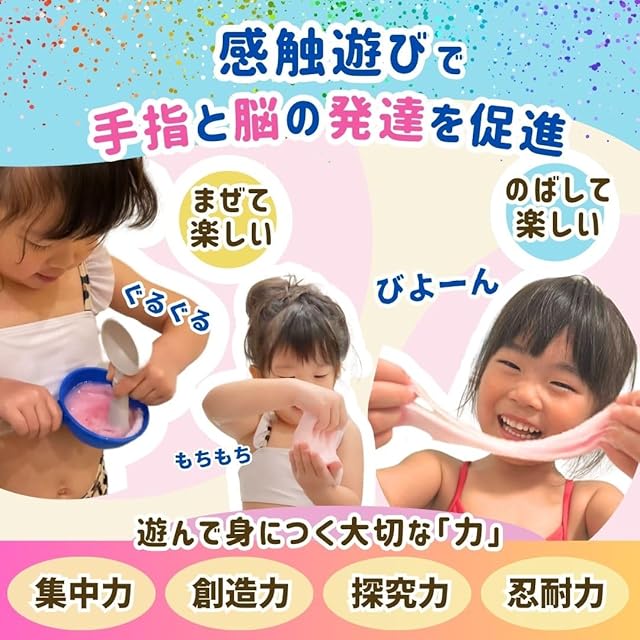 一般的なスライムには中毒の危険性のあるホウ砂が含まれていますが、肌にふれても安心な素材にこだわり、 保湿力の高い砂糖を主成分とし、石鹸成分以外はすべて食品原料にて製造しています。 全成分:スクロース、脂肪酸ナトリウム、増粘剤(食添)、着色料、香料