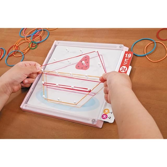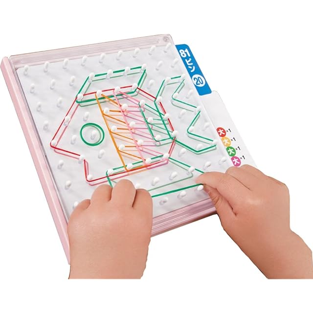 カラフルな輪ゴムをボードのピンにひっかけて、いろいろな模様をつくって遊ぶおもちゃです。