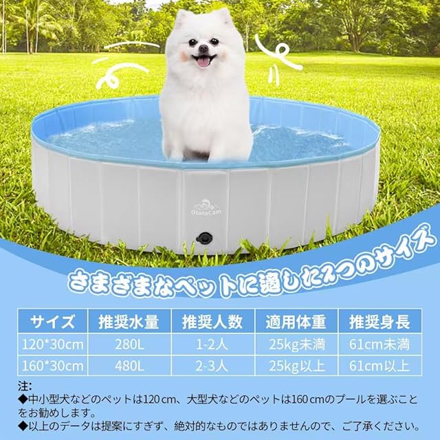 【子供用&ペット用プール】Ototacamのプールは2つのサイズがあります。直径120 ×高さ30cm(小型、中型犬などペットに適しています)、直径160 ×高さ30cm(中型、大型犬などペットに適しています)。ペットのサイズに合わせてプールサイズをお選びください。ペットと子供が一緒に遊んで夏を楽しむのに十分な大きさです!