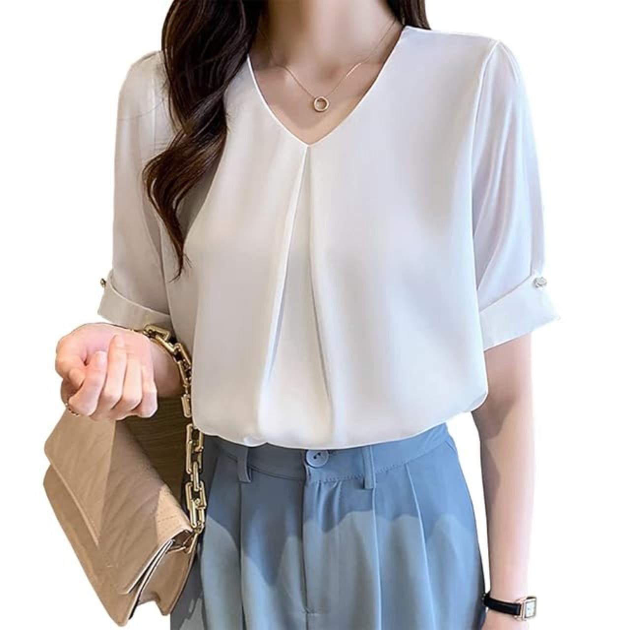 商品名:[Xiaoyu] ブラウス レディース 半袖 オフィス シフォン シャツ Vネック おしゃれ トップス ビジネス 通勤 洗える 春 夏 (L, ホワイト)