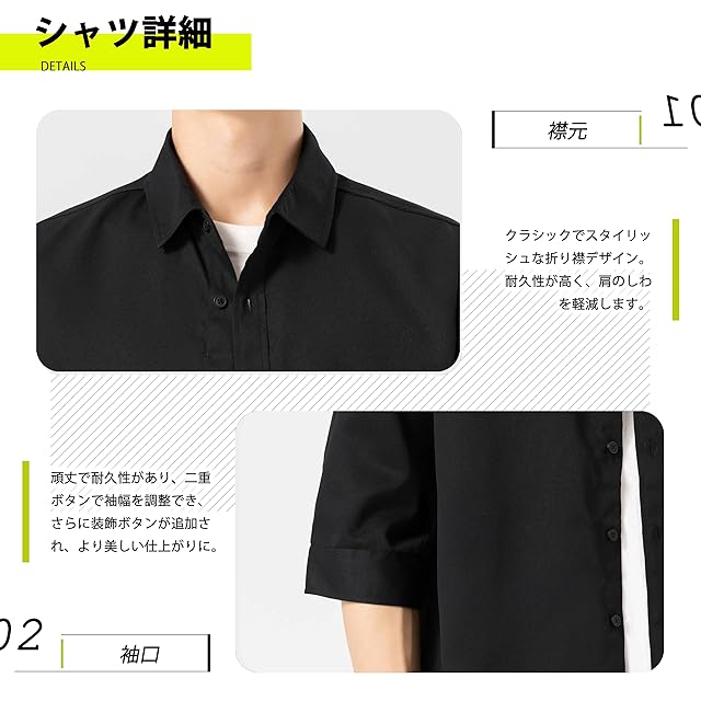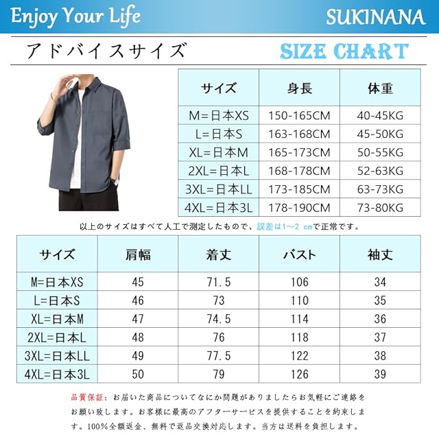 <p><b>Sukinana シャツ メンズ 七分袖 五分袖 夏服 ゆったり 通気性 速乾性 柔らかい 快適な 大きいサイズ カジュアル シンプル オシャレ 無地 ワイシャツ</b></p> <ul> <li>素材: ポリエステル</li> <li>適用対象:メンズ</li> <li>サイズ:M、L、XL、2XL、 3XL、 4XL</li> <li>季節に適しています:春、夏、秋</li> </ul> <ul> <li>「ご注意点」サイズの参照:M =日本XS、身長の目安:150-165cm、体重:40-45kg。L =日本S、身長の目安:163-168cm、体重:45-50kg。XL =日本M、身長の目安:165-173cm、体重:50-55kg。2XL =日本L、身長の目安:168-178cm、体重:52-63kg。3XL=日本LL、身長の目安:173-185cm、体重:63-73kg。4XL=日本3L、身長の目安:178-190cm、体重:78-80kg。※例:普段Mサイズを着用されている方はXLサイズを購入して頂くのがオススメ。ゆったりとした着心地がお好みの場合は、1サイズ大きめをお選びください。</li> <li>[機能性素材の叡智]肌触りが良く、通気性と耐摩擦性に優れた素材を採用。ビジネスから日常着用まで、型崩れしにくくお手入れ簡単。シワになりにくい耐久性と、洗練されたデザインが魅力の一枚です。 </li> <li>[こだわりのデザイン]サイドのカーブした裾、シンプルなポケット、補強された袖など、細部まで徹底的に設計。今年のトレンドを取り入れたシルエットに複数回の修正を加え、ビジネスからカジュアルまで幅広いシーンで活躍するスタイルを実現しました。 </li> <li>「簡単にコーディネート可能」五分袖デザインで夏の暑さにも快適。ワイドパンツ、カジュアルパンツ、ジーンズ、チノパンなど、全てのボトムスとシームレスに調和。豊富なカラーとサイズ展開で、男性のワードローブに欠かせない定番アイテムです。 </li> <li>「丁重に声明する」購入後30日以内に、ご不満があった際は、返品・返金対応いたします。弊社が数年前から服を販売していますが、弊店にすべての商品は実物をそのままで撮影したので、ご安心して買いていただくようお願い申し上げます。</li> </ul>
