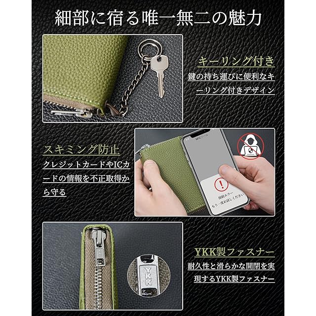 【スキミング防止&YKKファスナー】 個人情報を守るためのスキミング防止機能を搭載、不正スキャンから大切なカードをしっかり保護します。滑らかな開閉を実現する高品質なYKKファスナーを採用し、耐久性も抜群で、カードケースを長く安心してお使いいただけます。