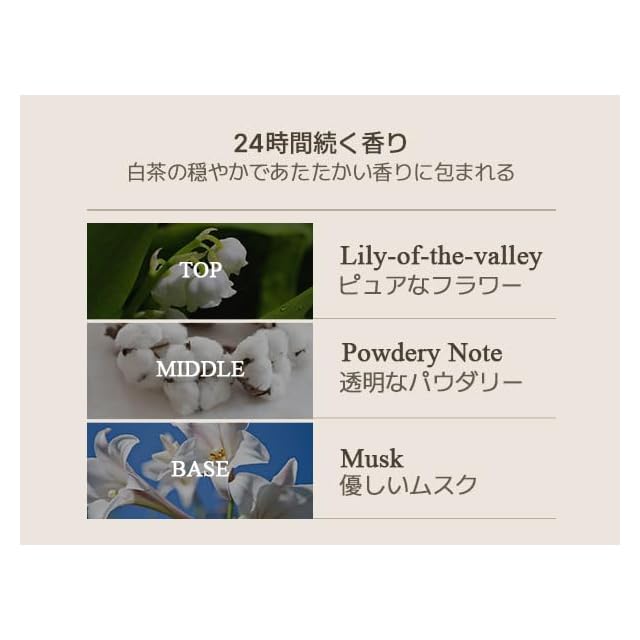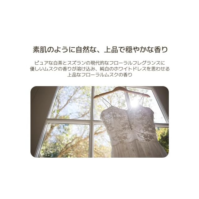 【POINT 1. 香り】 リリーの花の香り + 柔らかなパウダーの香り + 温かみのあるムスクの香り。3つの組み合わせで清潔なホワイトドレスを連想させるフローラルムスクの香りです。