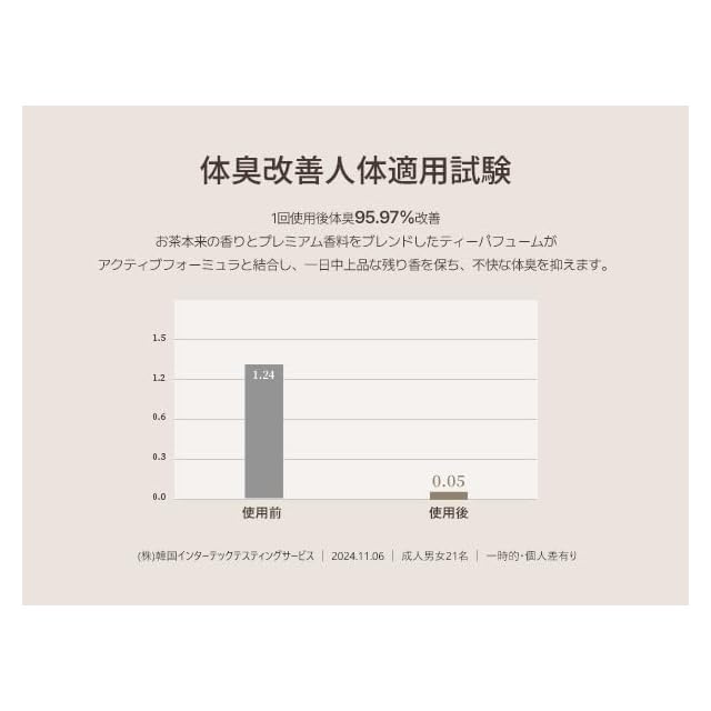 【POINT 2. 低刺激スクラブパフュームボディウォッシュ】 微細な緑茶の葉が肌のキメを整え、pH微酸性フォーミュラで水分の損失を最小限に抑え、老廃物や角質を優しくスッキリと洗浄します。刺激指数0.00で、すべての肌タイプに安心して使用できます。