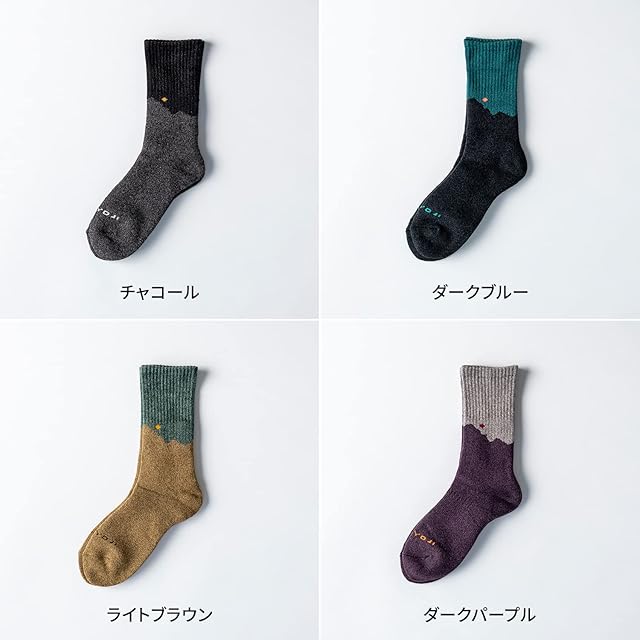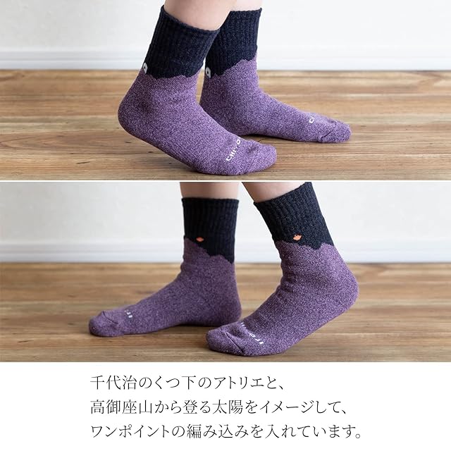 ドラロン綿を使用した日本製のトレッキングソックス。<br> ハイキングやウォーキング、アウトドア、スポーツに最適。<br> 普段履きにもおしゃれに履いていただけます。<br> 全パイルで厚みのある生地が、足を衝撃から守ります。<br><br> ドラロン綿はコットンとアクリルの混紡素材です。<br> 高い耐久性・吸湿性と、コットンの柔らかな履き心地を両立しています。<br><br> 千代治のくつ下の工場は、播磨の名峰、高御位山(たかみくらやま)の麓にあります。<br> 高御位山は山頂からの見晴らしが良く、美しい初日の出が見られることで有名です。<br> この靴下は、そんな高御座山の山影をモチーフにつくりました。<br> 千代治のくつ下のアトリエと、高御座山から登る太陽をイメージして、ワンポイントの編み込みを入れています。<br> つま先には「CHIYOJI」の刺繍が入っています。