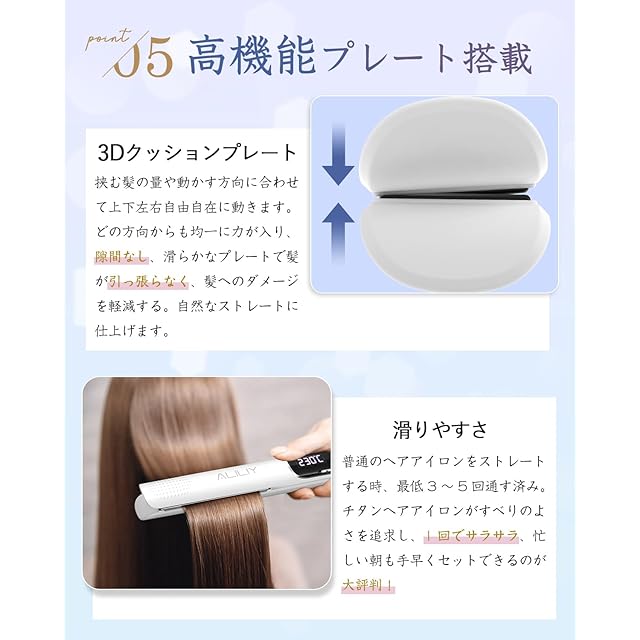 【チタンヘアアイロン&3Dクッションプレート】Aliliy ヘアアイロンは鏡のようなミラーチタニウムプレートを採用し、滑りやすさと熱伝導性の高さによって、熱や摩擦によるダメージを抑えながら、ツヤと潤いのある髪に仕上げます。また、従来製品より3倍滑らかなプレートを搭載することで摩擦による髪のダメージを抑えます。滑らかなプレートで髪が引っ張らない。また立ち上がりが速い(180℃の場合約25秒)、忙しい朝でも時短スタイリングを可能です。上下自由に動く3Dクッションプレートでどんな方向からも均一に力が入るので、自然に綺麗なストレートになります。更に耐久性に優れているので、長期間使える点も魅力です。