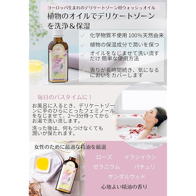 【商品説明】 ◆デリケートゾーン用洗浄オイル「フェミノール」は、植物から抽出したオイルでデリケートゾーンを洗浄、乾燥から守ります。ローズ、イランイラン、ゼラニウム、パチュリ、サンダルウッドの5種の精油を配合し、自然の芳香が長く続きます。 ◆ 使い方はとても簡単。手のひらに適量をとり、バスタイムにデリケートゾーンになじませ、数分おいてからお湯で流します。
