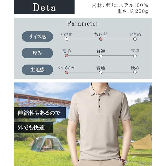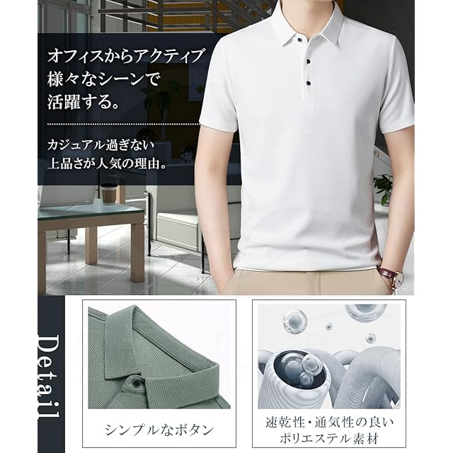 【Detail】オフィスからアクティブ様々なシーンで活躍する。カジュアル過ぎない上品さが人気の理由。速乾性・通気性の良いとシンプルなボタンでポリエステル素材。
