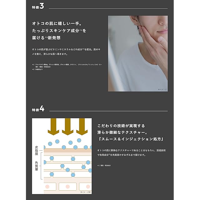 【たっぷりスキンケア成分を届ける新発想】オトコの肌が喜ぶビタミンやミネラルなどの成分を配合。肌のキメを整え、滑らかな肌へ導きます。