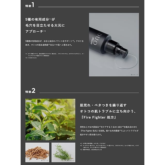 【5種の有用成分が毛穴を目立たせる大元にアプローチ】5種類の有用成分が、水分と油分のバランスをサポート。テカリを防ぎ、オトコの肌を透明感あるツヤ肌へと導きます。