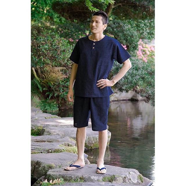 商品名:綿の郷(ワタノサト) 日本製 久留米ちぢみ織ホームウエア 甚平 作務衣 (L, 文人柄・紺)