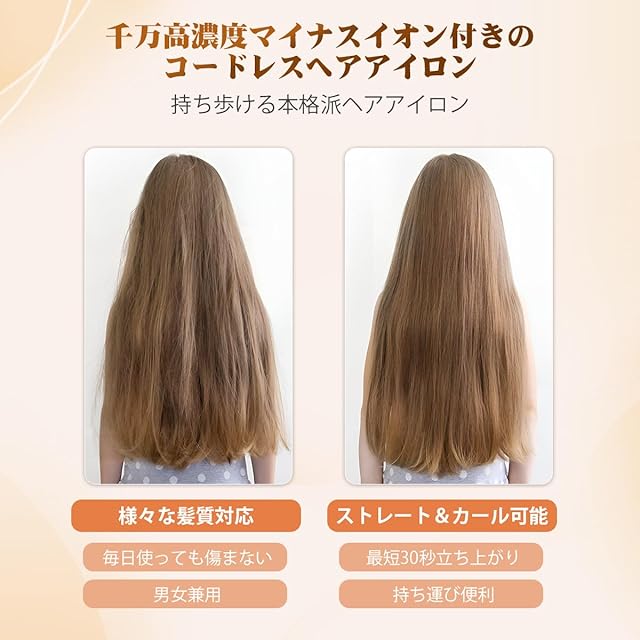 【千万マイナスイオン機能付き】おしゃれなコードレスデザインとミニサイズでスタイリングが簡単。当社のヘアアイロンは、高濃度のマイナスイオン植物オイルでコーティングされており、使用後は髪が滑らかになり、自然な輝きが生まれます。同時に、静電気を防ぎ、縮れ毛やふさふさした髪を抑え、枝毛を効果的に減らすことができます。