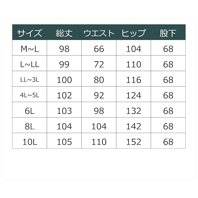 【M~L】:総丈:98、ウエスト:66、ヒップ:104、股下:68【L~LL】:総丈:99、ウエスト:72、ヒップ:110、股下:68【LL~3L】:総丈:100、ウエスト:80、ヒップ:116、股下:68【4L~5L】:総丈:102、ウエスト:92、ヒップ:124、股下:68【6L】:総丈:103、ウエスト:98、ヒップ:132、股下:68【8L】:総丈:104、ウエスト:104、ヒップ:142、股下:68【10L】:総丈:105、ウエスト:110、ヒップ:152、股下:68